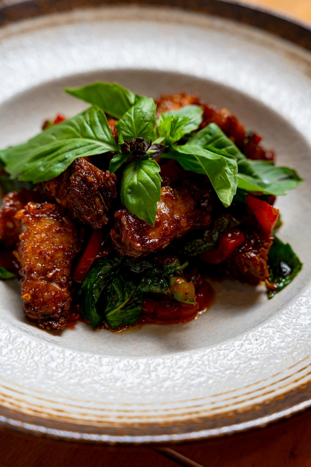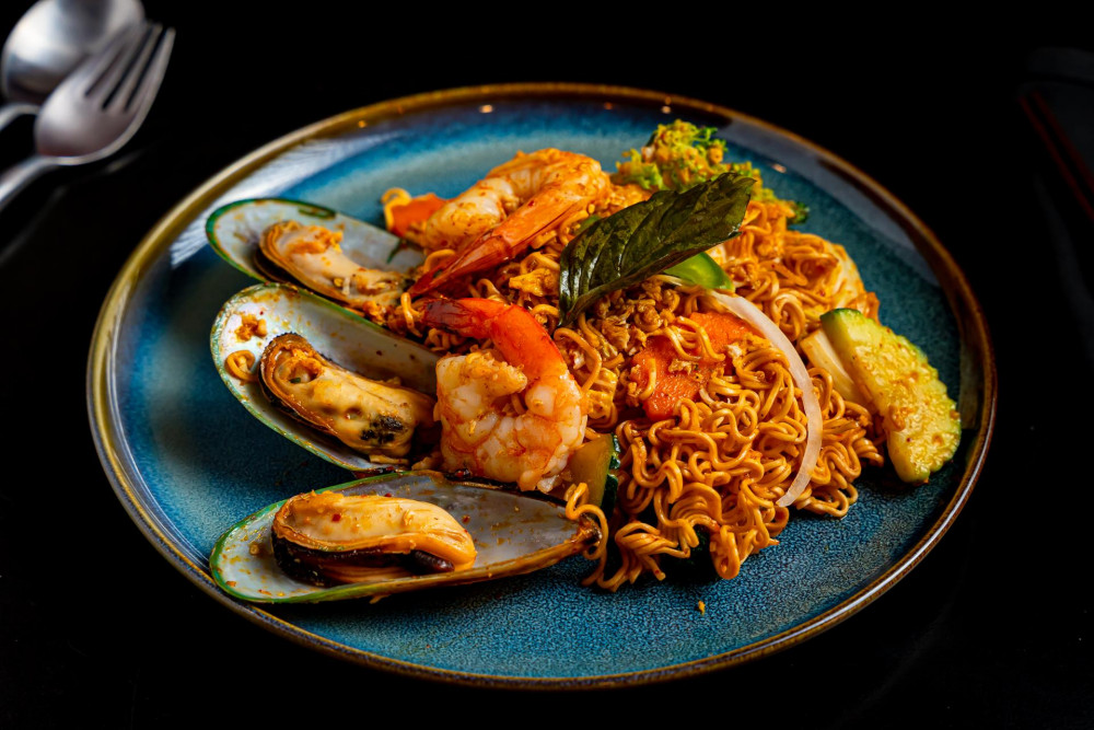Crispy branzino, green leaf lettuce, vermicelli noodle, kana leaf, peanuts, red onion, ginger served with seafood sauce