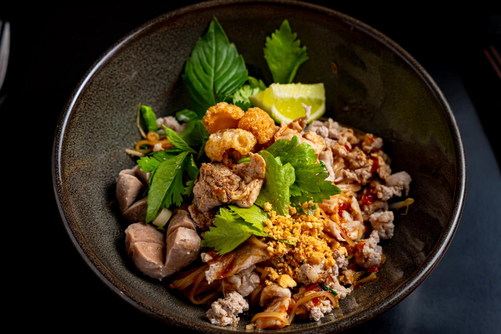Dry vermicelli noodle, pork slice pork meatball. Topped with cilantro, and bean sprout. Served with spicy soy vinaigrette