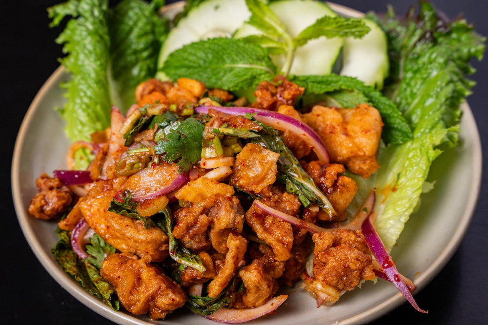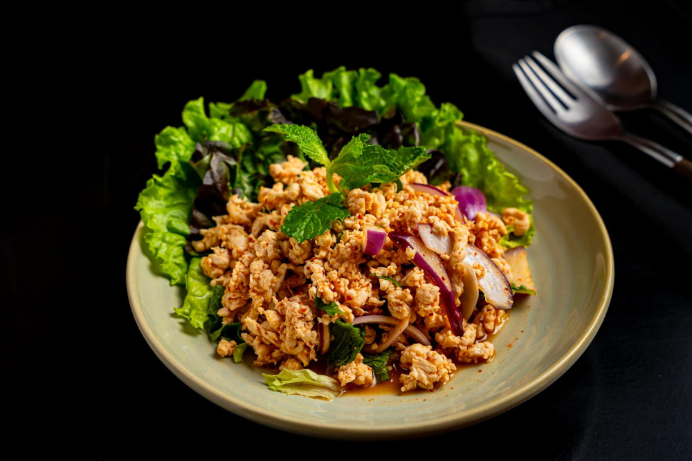 Minced chicken, red onion, scallion, onions, green vegetables cilantro and mint in chili lime sauce
