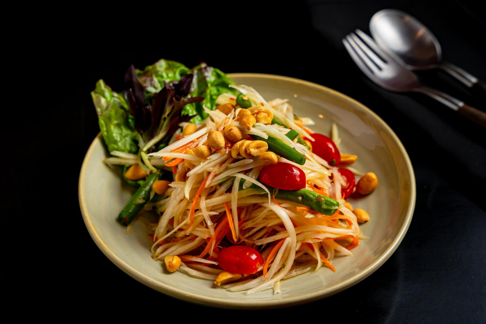 Green papaya, tomato, carrots, string bean, peanuts, and garlic in fresh chili lime sauce