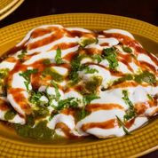 Round Fried Ball Made of Flour and Dough Filled with Veg Stuffing, Covered with Yogurt and Chutnies.
