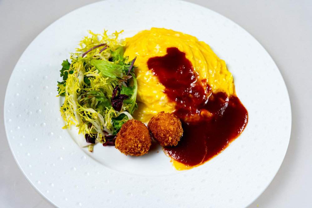 Parmesan, mozzarella & cheddar, ham fried rice, umami demi glaze, mesclun radicchio salad, corn cream croquette