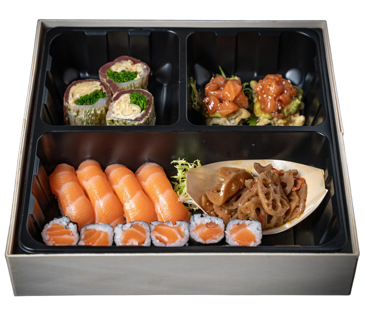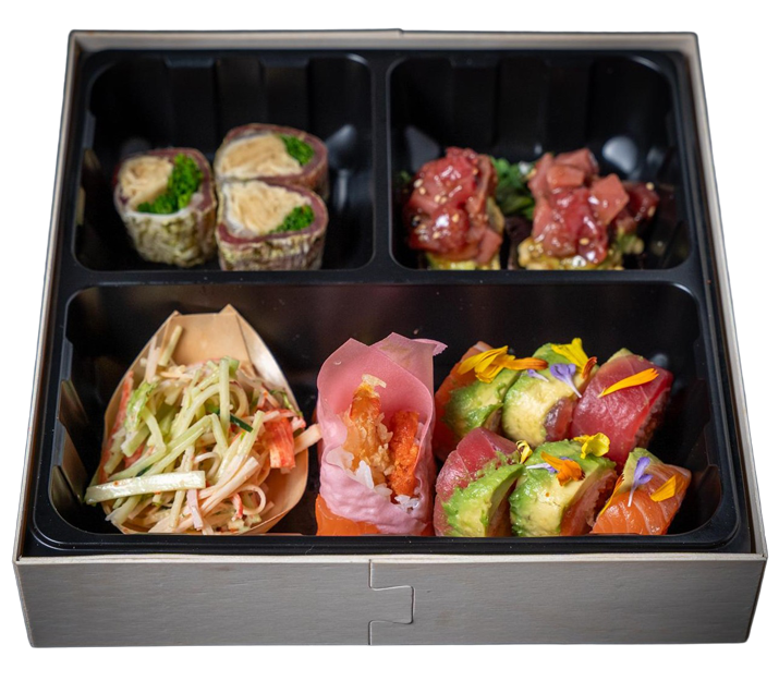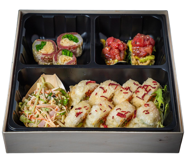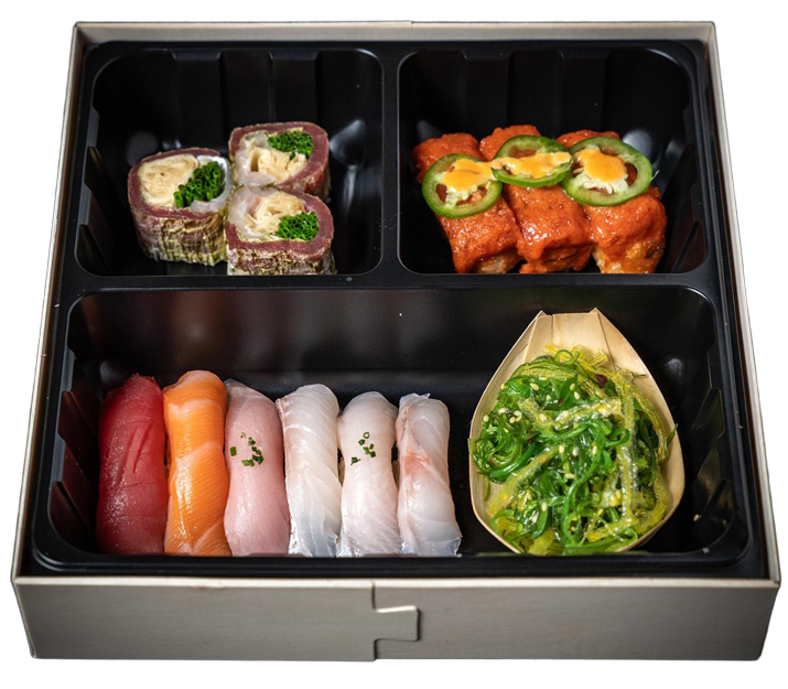 assorted sushi, spicy tuna crispy rice sushi, seaweed salad, sushi maki konbu