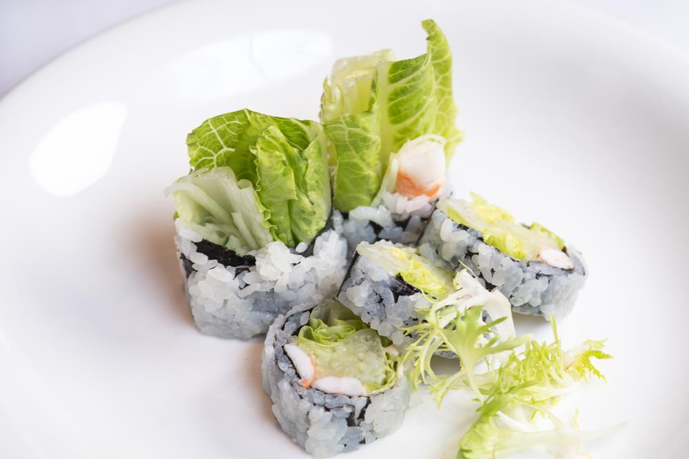 seasonal organic vegetables & fruits wrapped with rice paper, yuzu wasabi soy