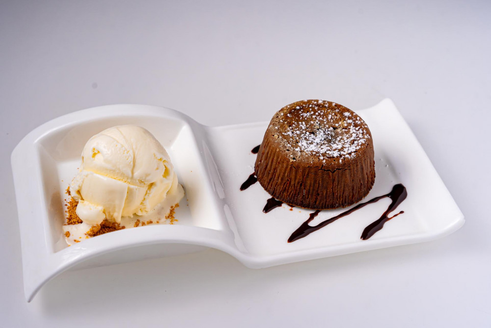lava chocolate cake, vanilla ice cream
