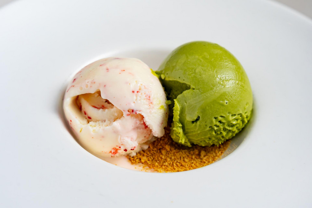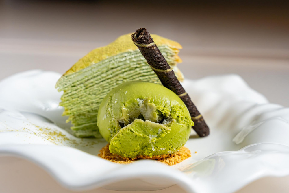 green tea layers cake, served with green tea ice cream