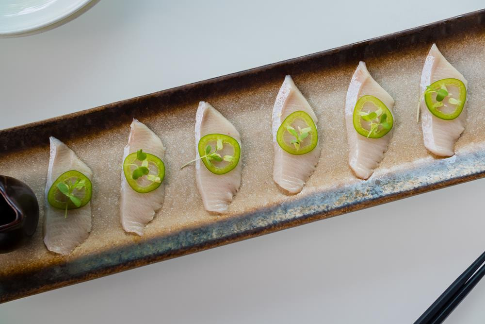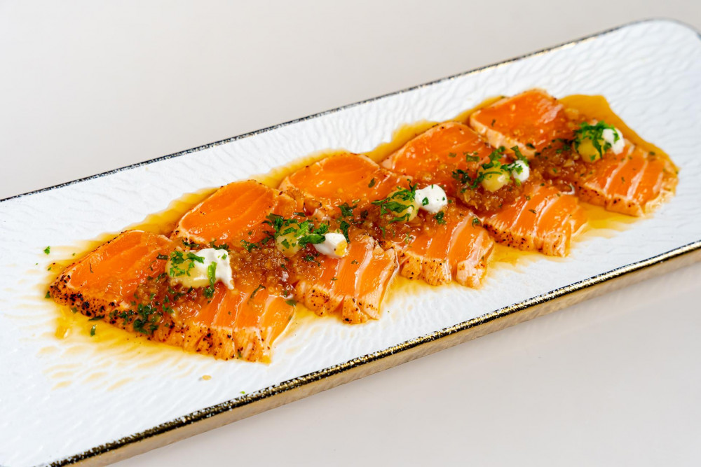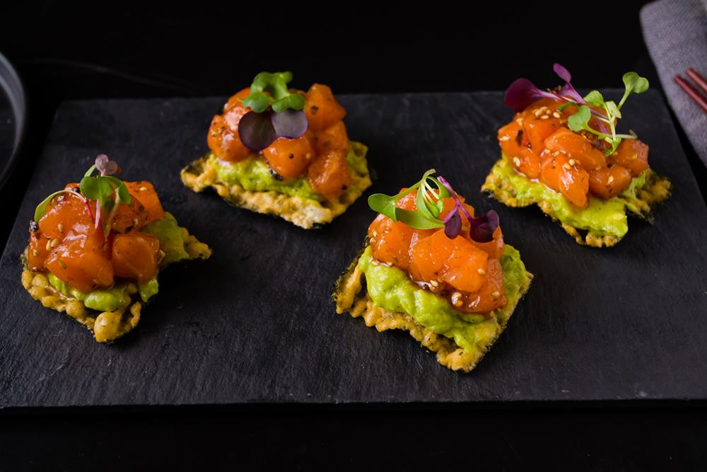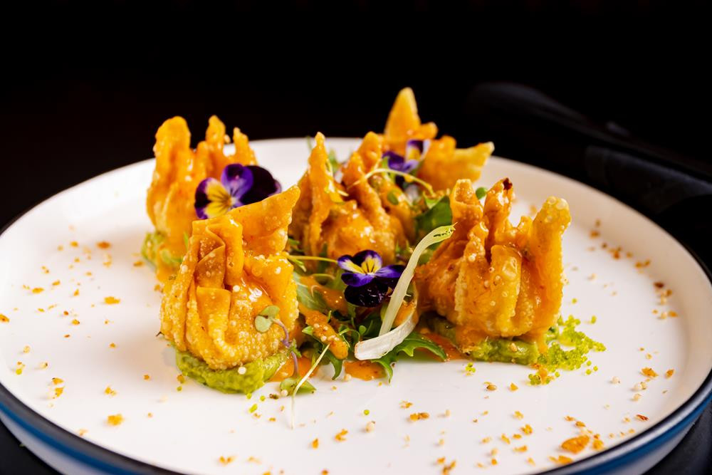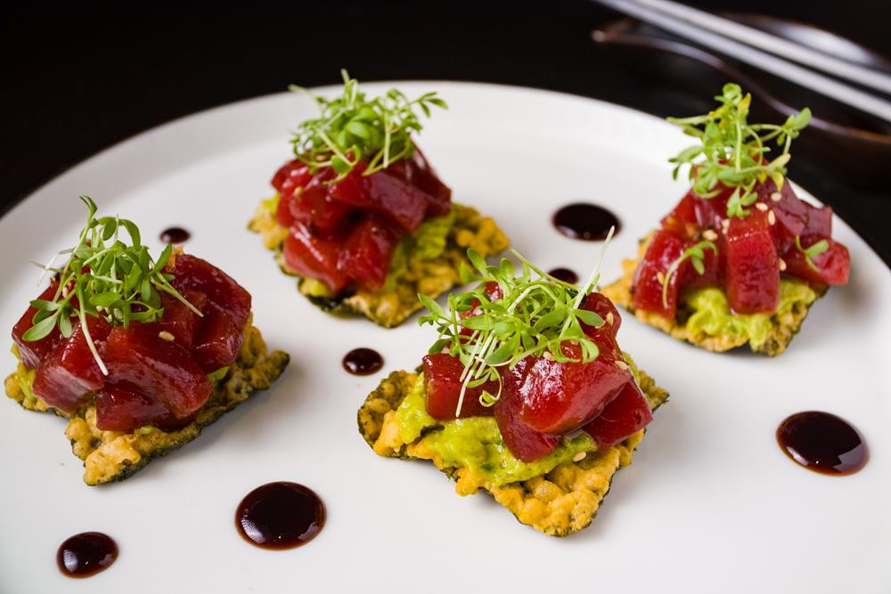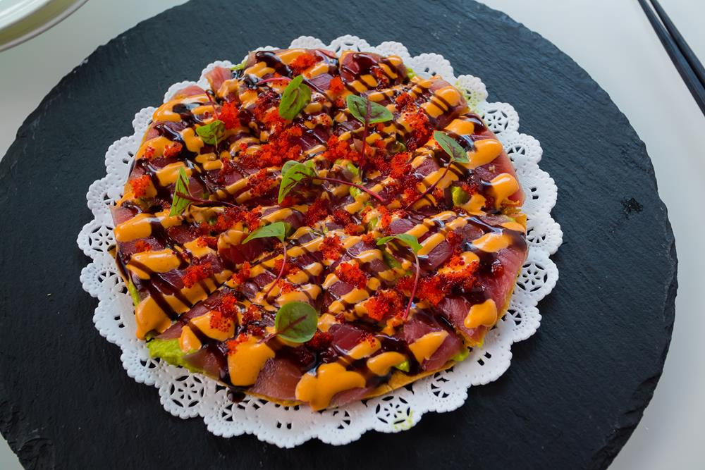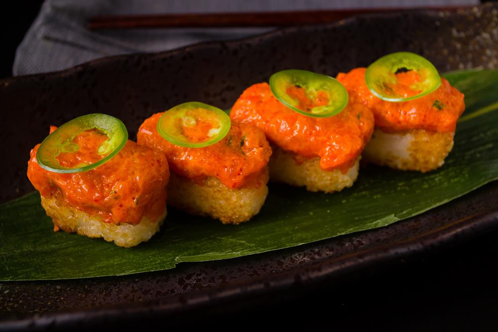 lightly fried with bluefin tuna, wasabi tobiko, mozzarella cheese yuzu tobiko, guacamole. togarashi crunch. sweet chili emulsion
