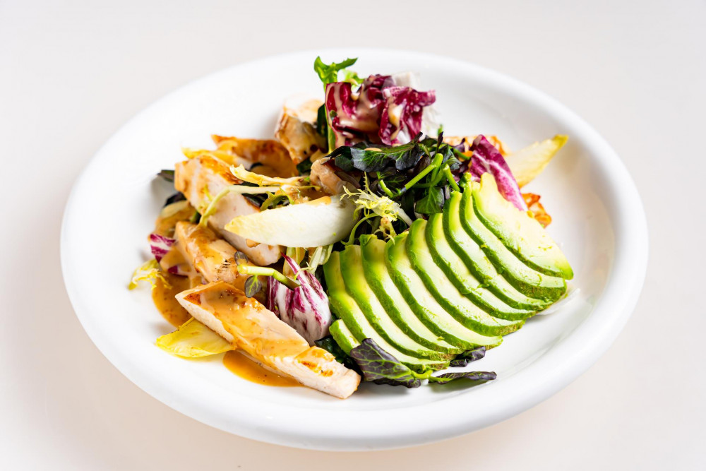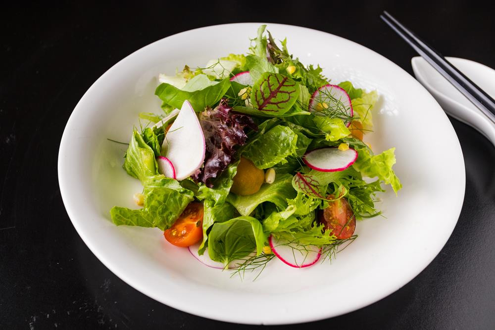 mesclun & organic baby romaine heart lettuce, cherry tomatoes, carrot, red radish pineapple ginger dressing. add avocado or spicy tuna