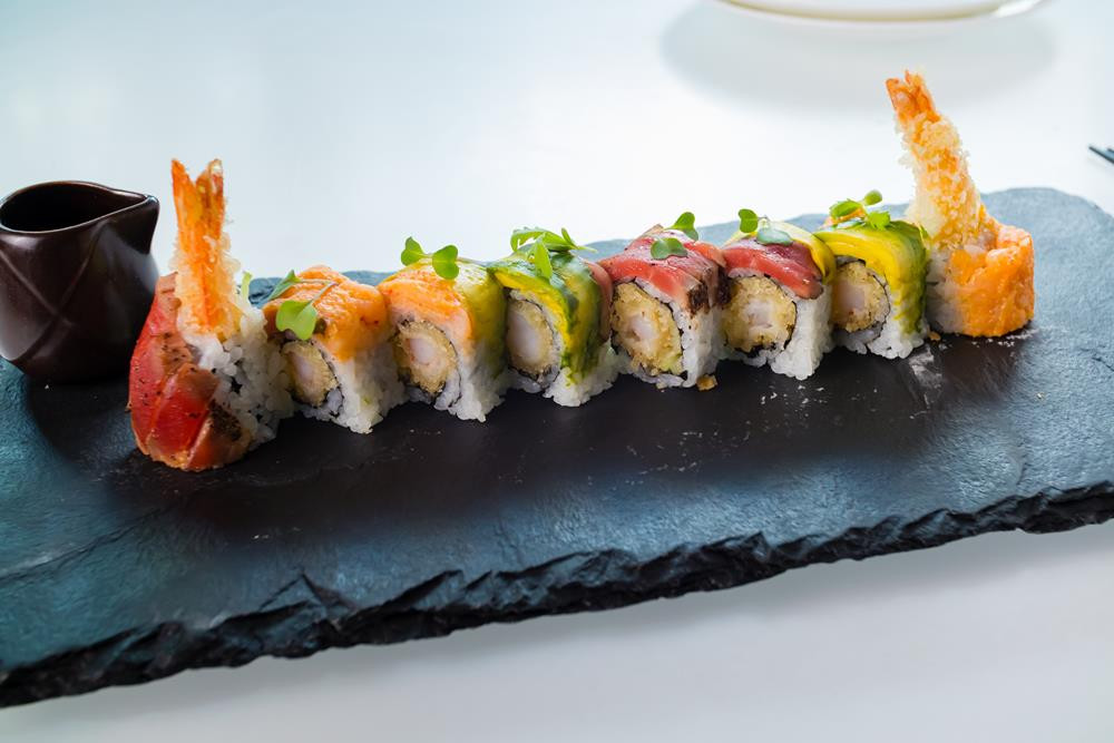 shrimp tempura & spicy tuna inside, topped with tuna, salmon & avocado, creamy yuzu and spicy momiji