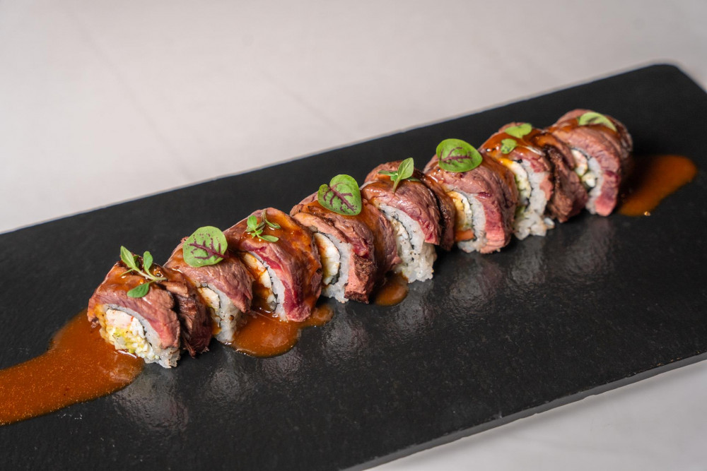 lobster tempura, avocado, cucumber, kani, kewpie mayonnaise roll, top with seared Filet Mignon, port wine reduction