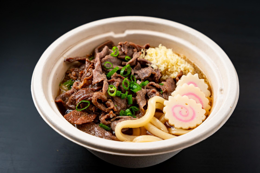 sukiyaki beef, narutomaki fish cake scallion, tempura flakes