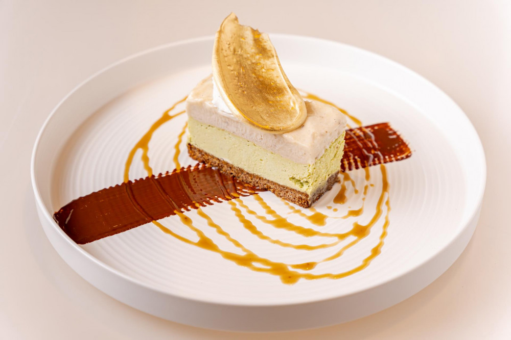 matcha cheesecake, banana creme with kokuto sauce