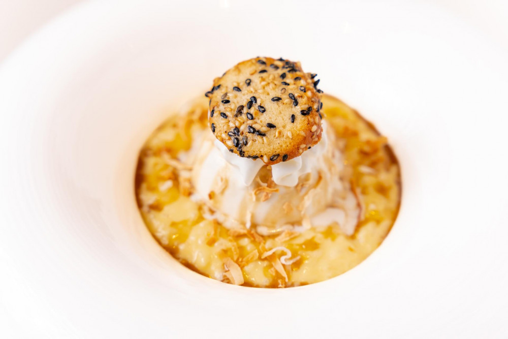 mango sticky rice pudding, sesame ice cream