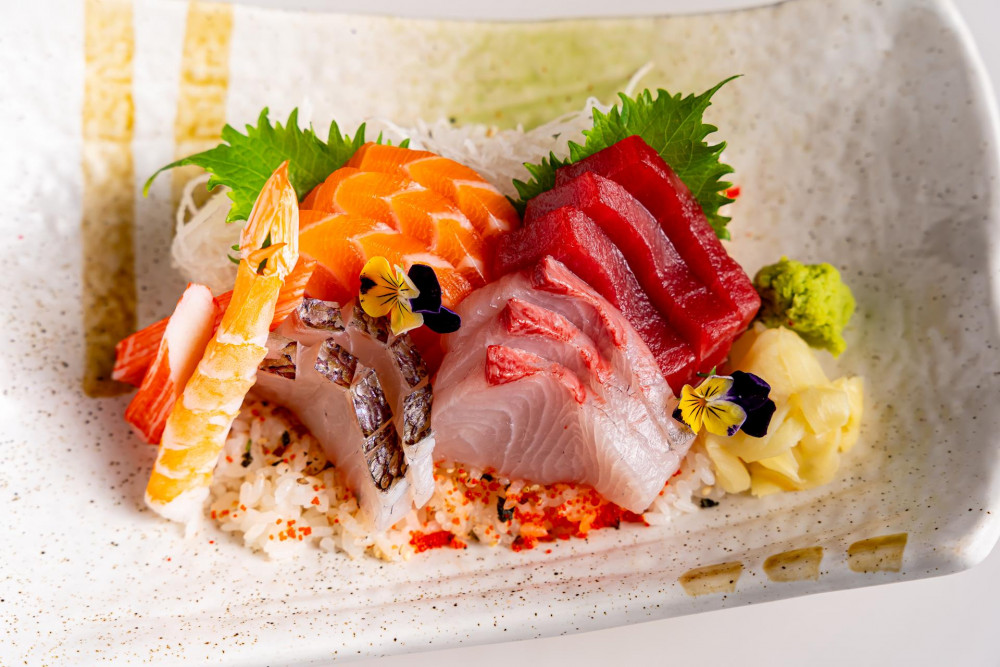 assortment fresh sashimi over seasoned sushi rice, fresh wasabi