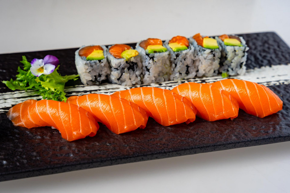 5 pieces salmon sushi & salmon avocado roll, fresh wasabi