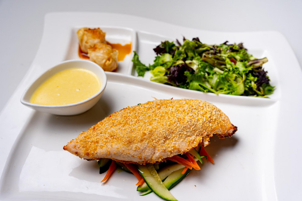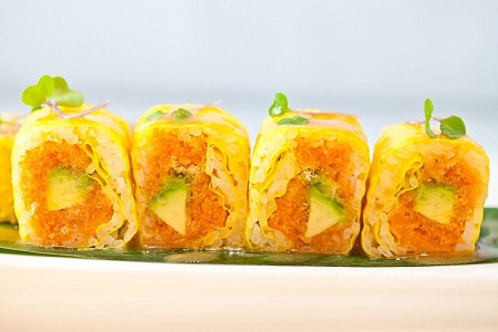 Spicy tuna, salmon, yellowtail, avocado & crispy noodle inside, wrapped with soy paper, plum sauce
