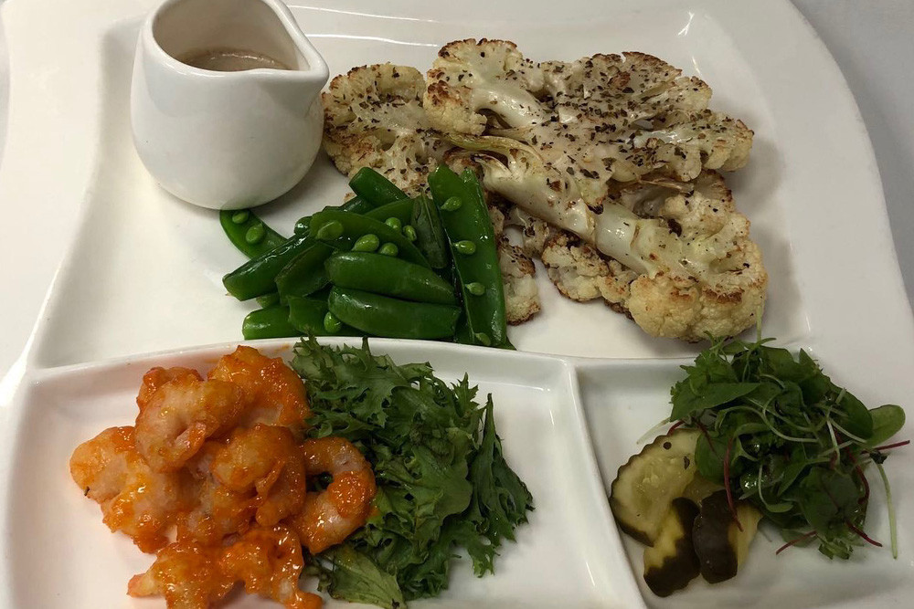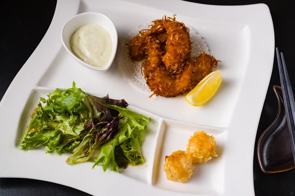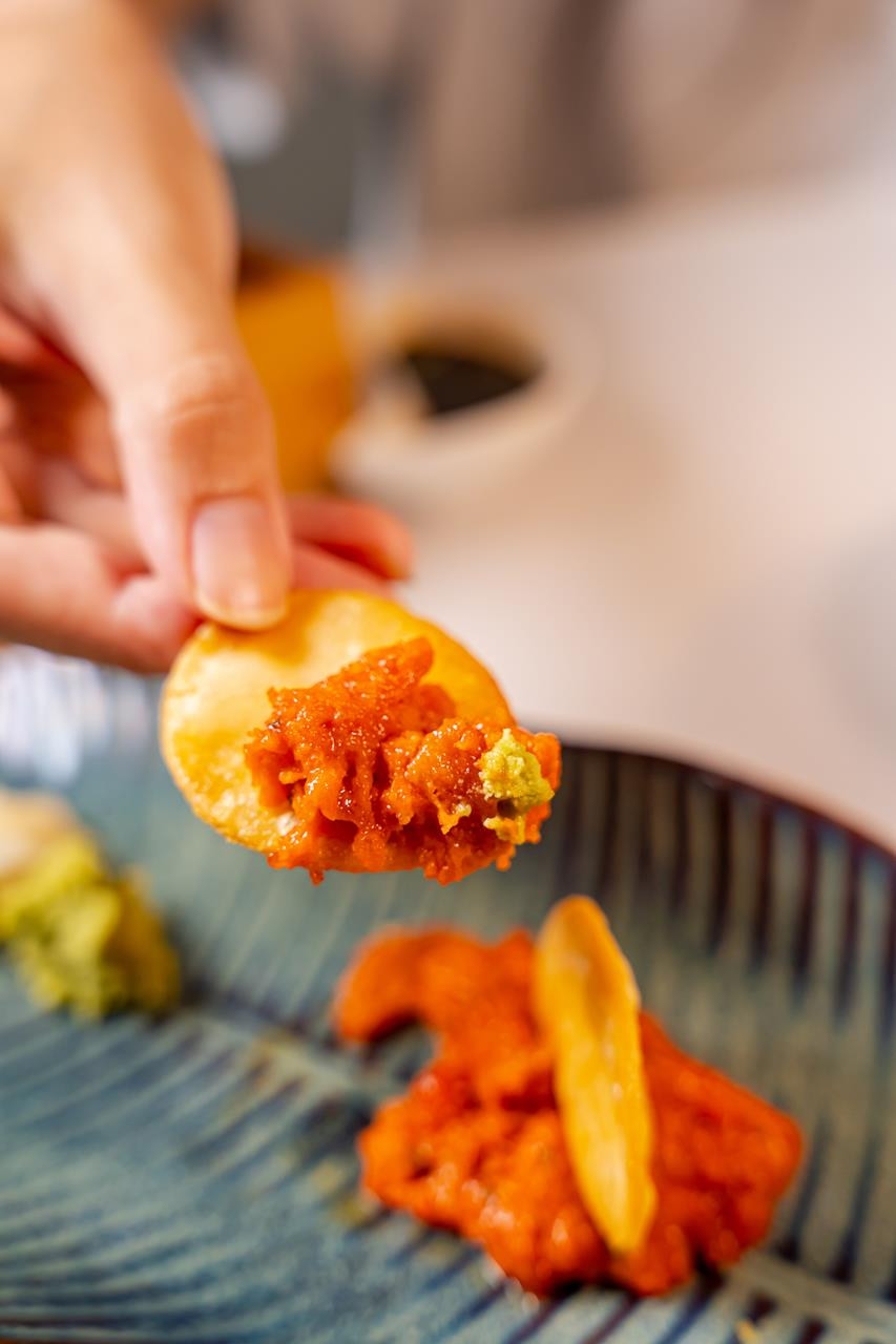 Shrimp tempura, avocado, topped with spicy kani. Citrus sweet miso & eel sauce
