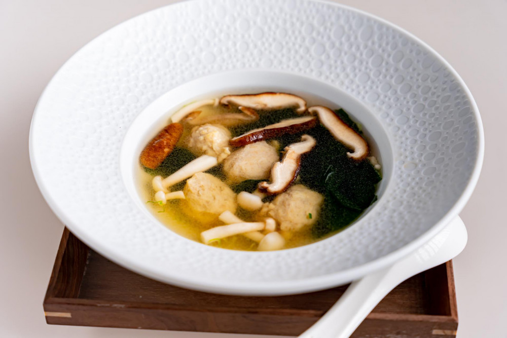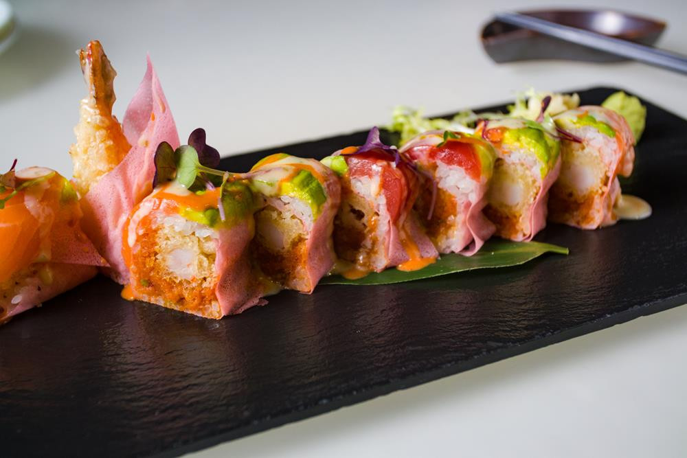 Shrimp tempura & spicy tuna inside, topped with tuna, salmon & avocado, creamy wasabi and spicy momiji