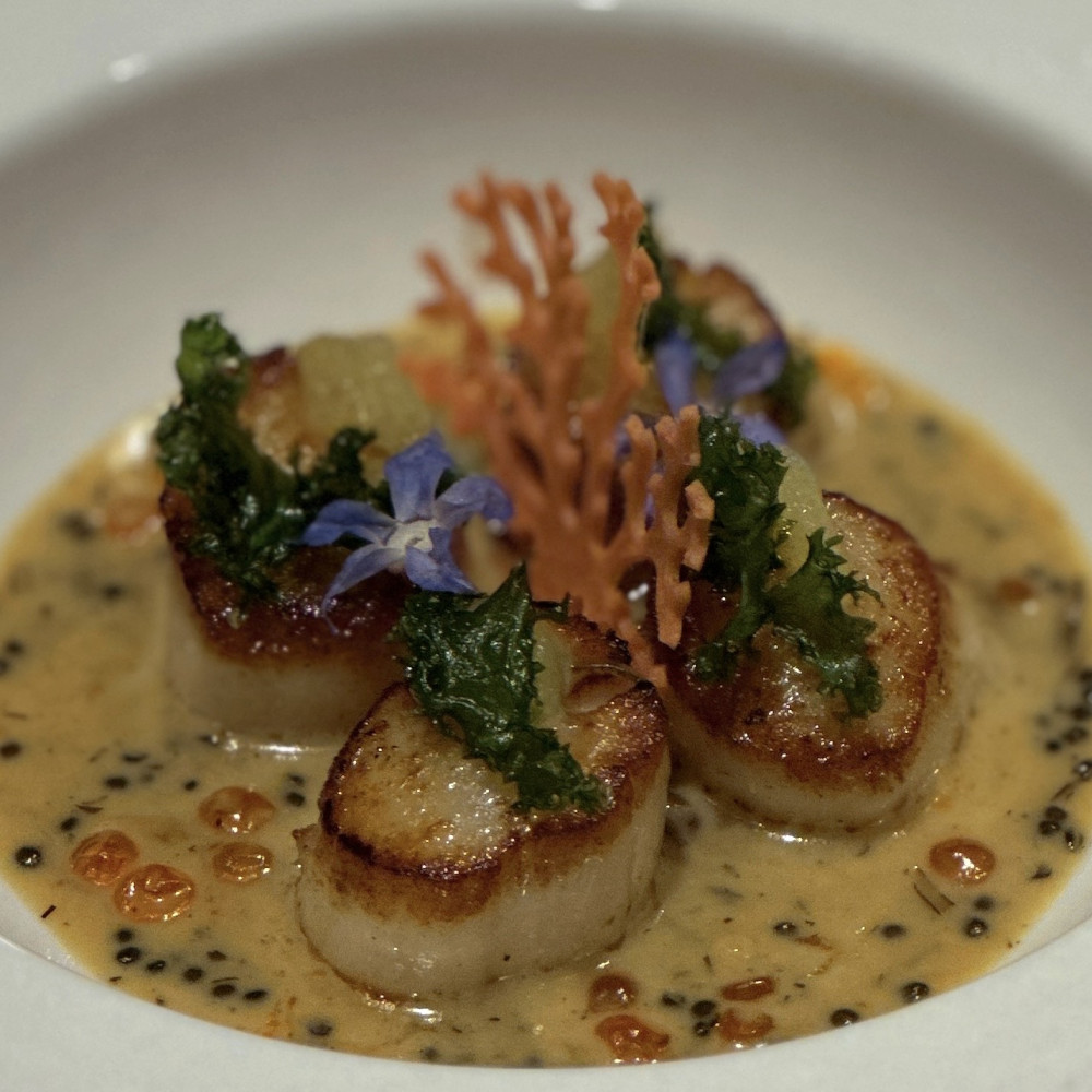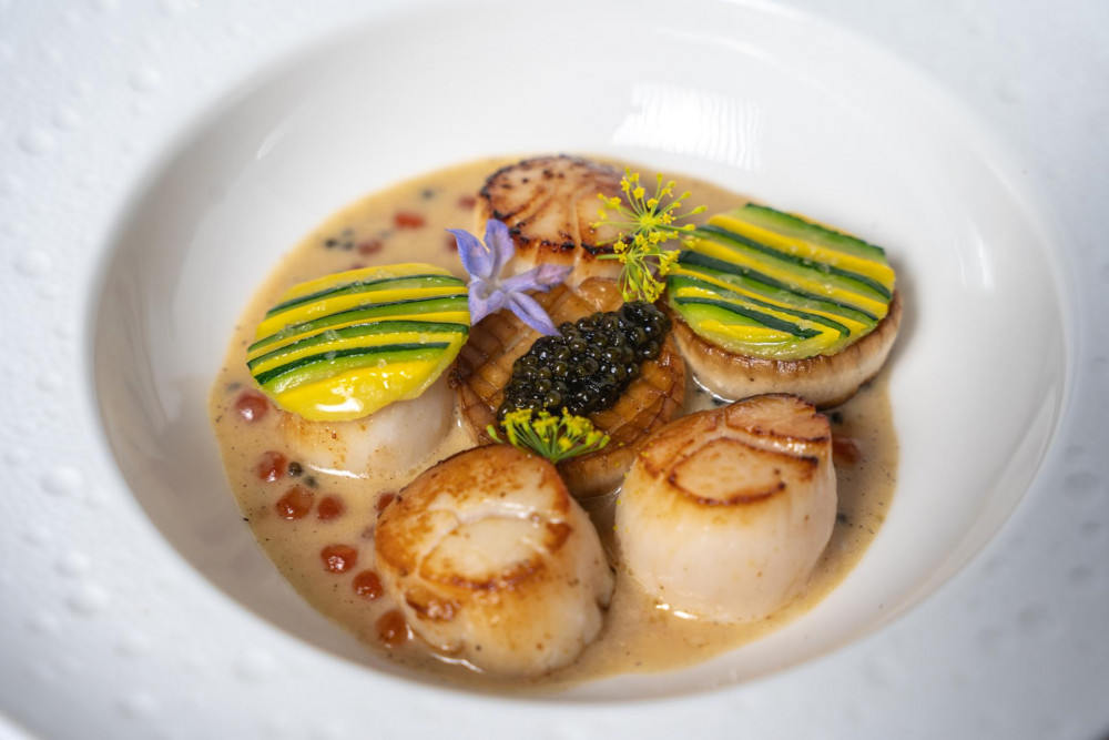 shio kombu miso cream sauce, royal assetra caviar, ikura, myer lemon jam