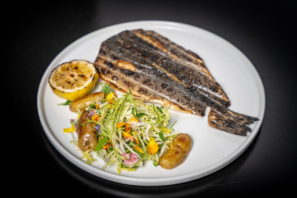 grilled with ladolemono sauce, spring herb salad, fingerling potato, charred lemon