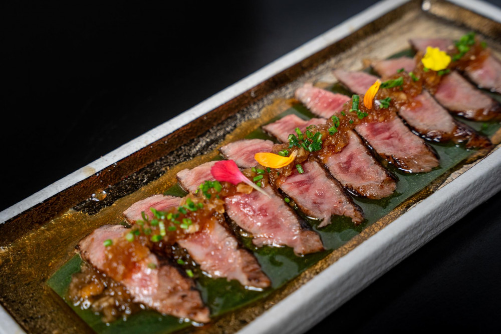 pan-seared crispy rice, topped with avocado, truffle puree, sweet miso sauce