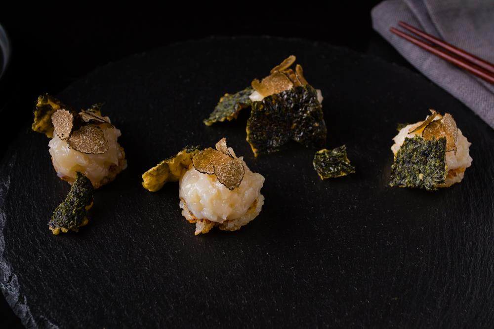 lightly fried with bluefin tuna, wasabi tobiko, mozzarella cheese yuzu tobiko, guacamole. togarashi crunch. sweet chili emulsion
