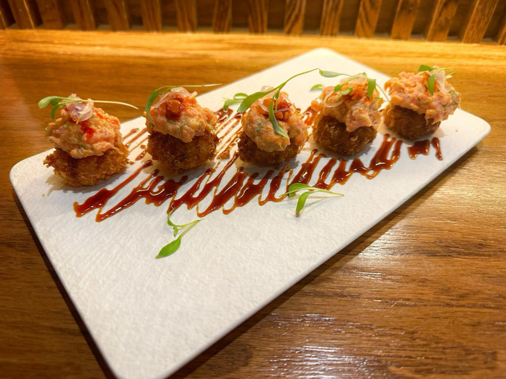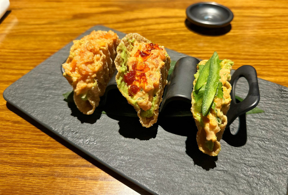 All comes with guacamole: 1 Spicy Salmon, mango, toasted tomatoes, 1 Spicy Tuna, crunchy spicy garlic, 1 Spicy Yellowtail, jalapeno, cilantro