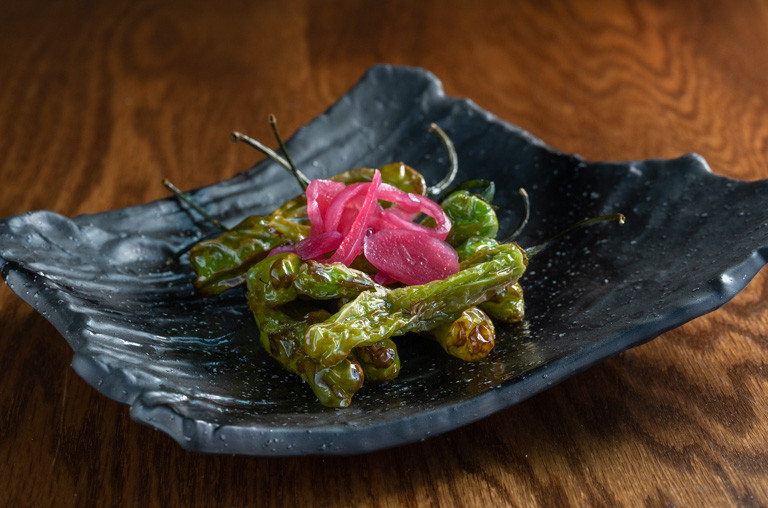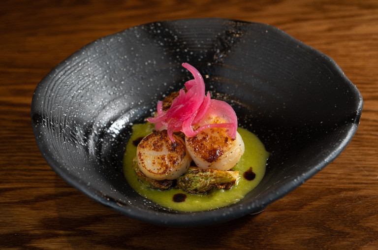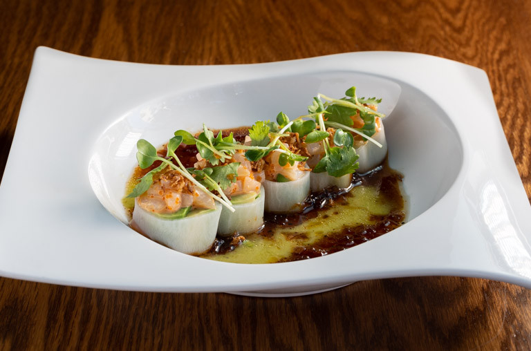 salmon, avocado, masago wrapped with pickled daikon topped with spicy squid, tomatillos sauce
