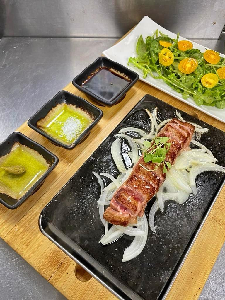 4 oz Pan seared A5 wagyu on a hot stone, yuzu kosho, ponzu, sea salt