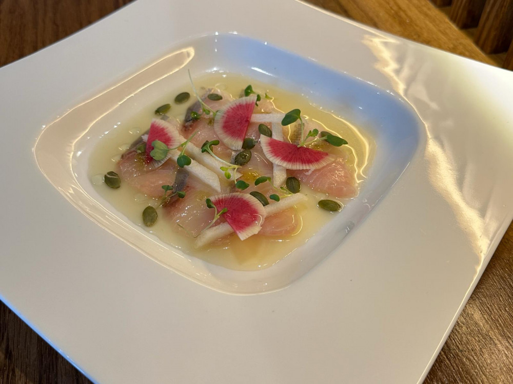 6 slices of amber jack woith yuzu kosho sauce, pear, watermelon radish, micro cilantro and pumpkin seeds