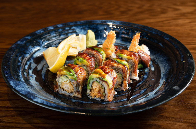 shrimp tempura, cucumber topped with eel avocado, eel sauce