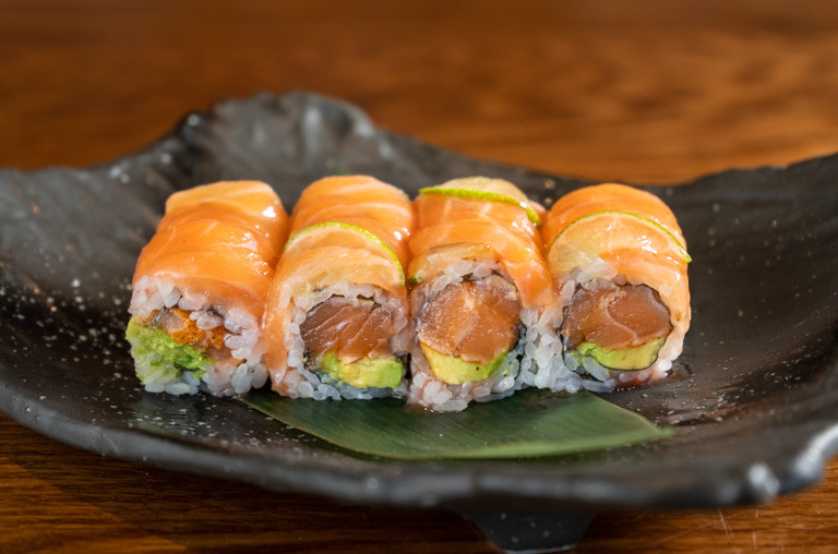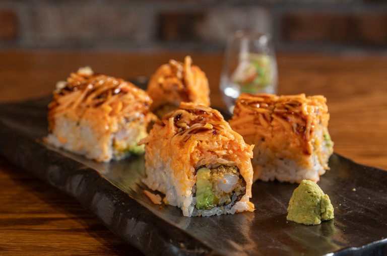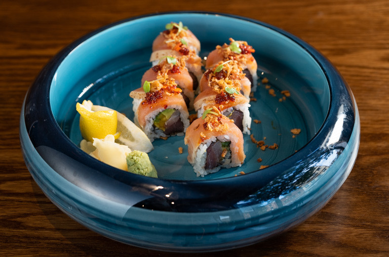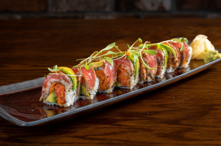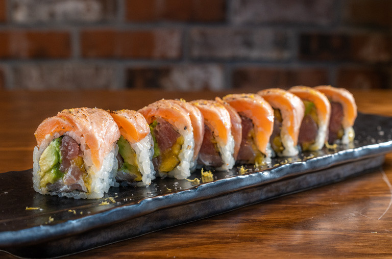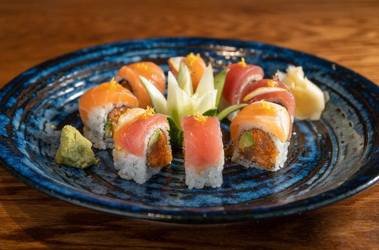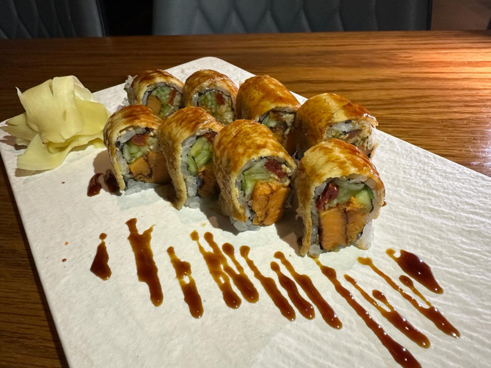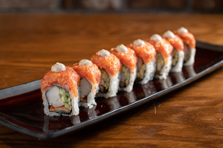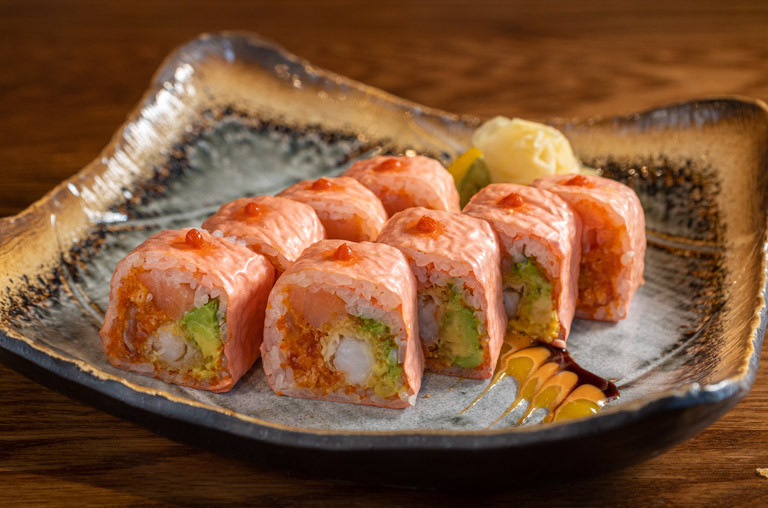 shrimp tempura, spicy tuna, avocado, smoked salmon, tobiko, soy paper with mango sauce