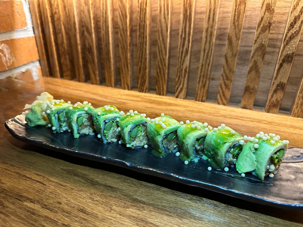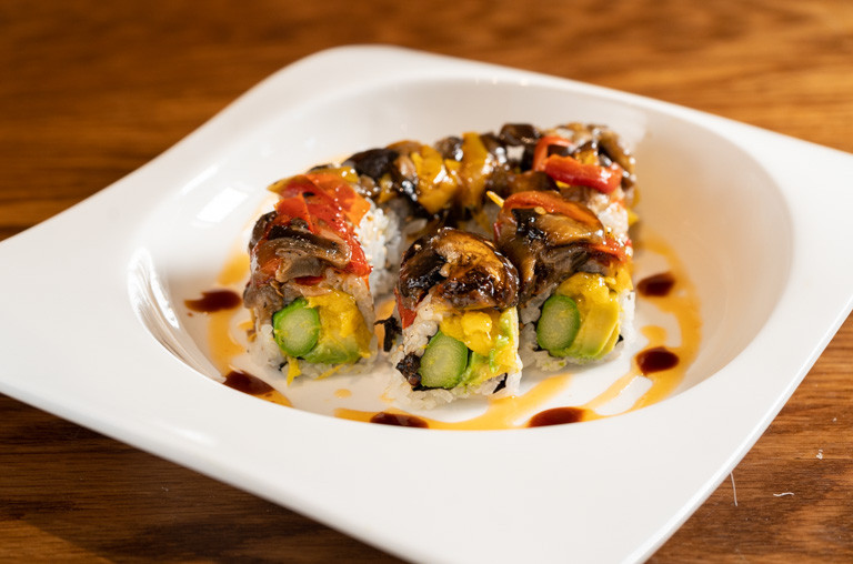 avocado, asparagus, mango topped with roasted bell pepper, red onion, shiitake, chili yuzu
