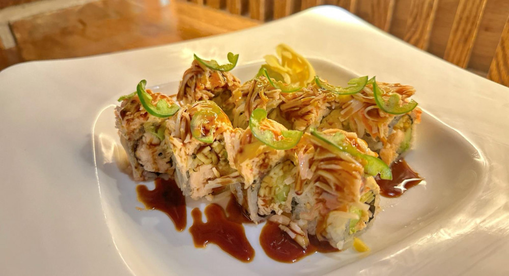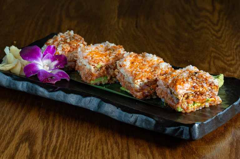 cooked salmon, avocado topped with spicy crab salad, jalapeno sliced and sweet sauce