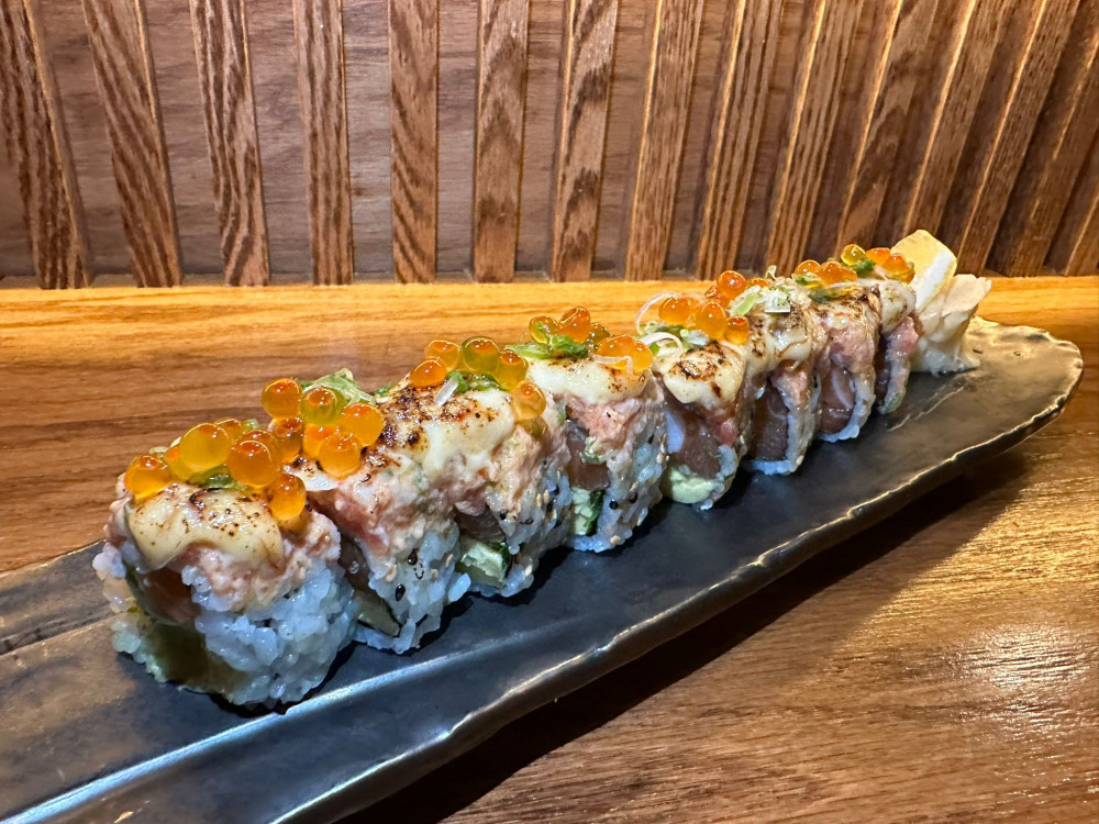 Kingcrab stick, salmon, oba, avocado topped with lightly seared spicy tuna, ikura and honey mustard aioli