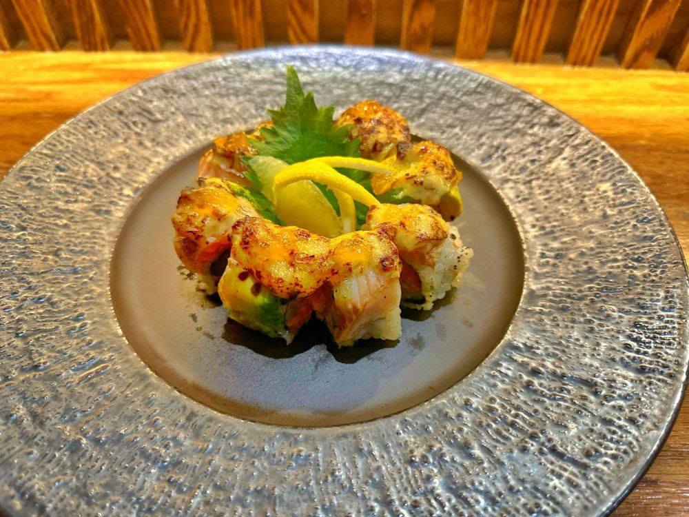 Crunchy spicy shrimp, asparagus topped with seared codfish, salmon toro, yuzu tobiko finished with chef's special sauce