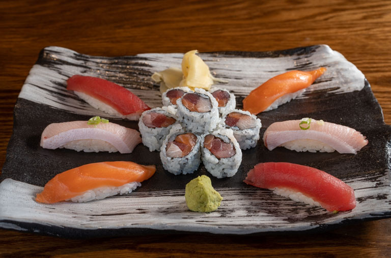 2 pcs of Tuna, 2 pcs of Salmon, 2 pcs of yellowtail and tricolor roll
