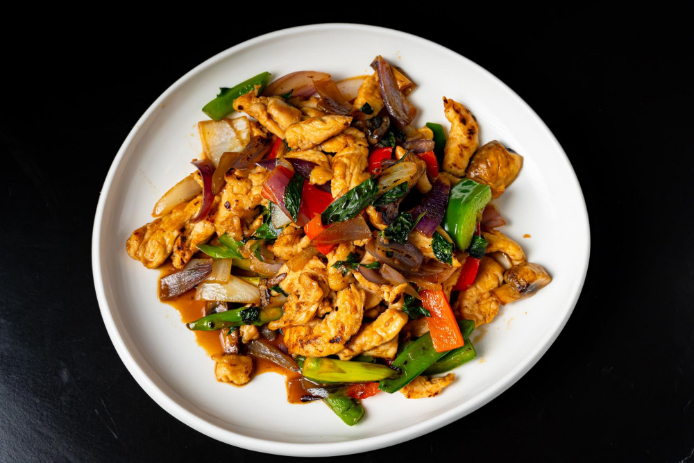 Wok sautéed chicken, mushroom, onion, carrot, fresh basil leaf, with chili sweet basil sauce