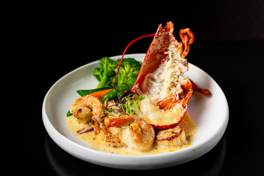 Grilled lobster, jumbo shrimp, scallop, onion, seasonal vegetables, and lemon garlic butter