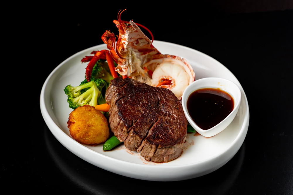 Grilled beef tenderloin and half Maine lobster, crispy mashed potatoes, port wine au jus reduction