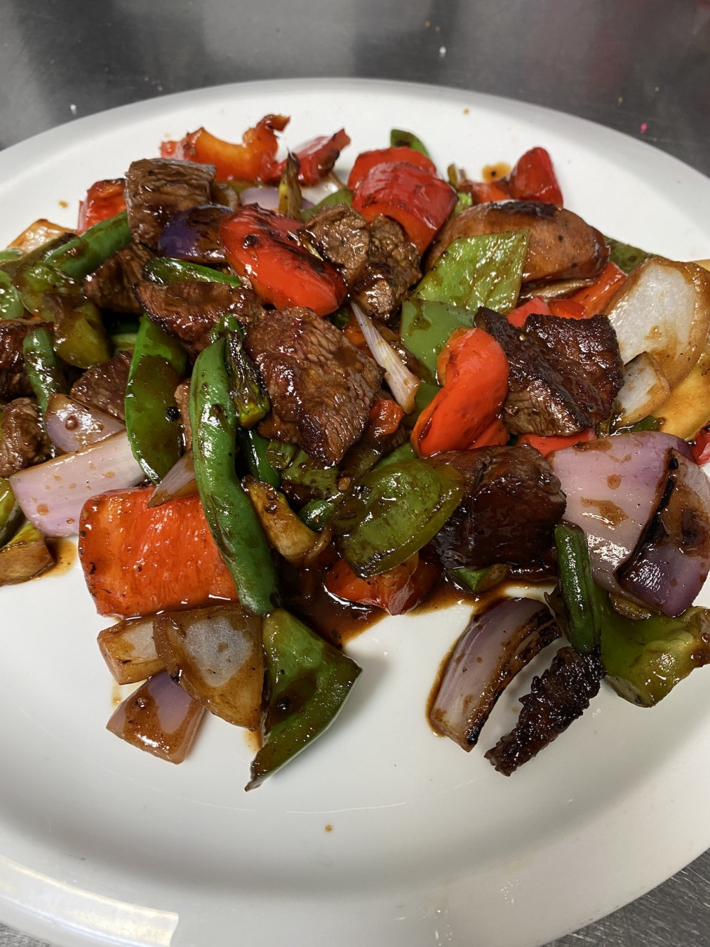 Mongolian filet mignon with chorizo, piquillo pepper, onion, mushroom, carrot, basil & soy maggi black pepper sauce