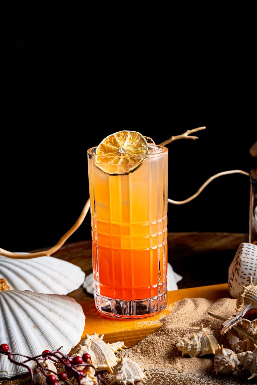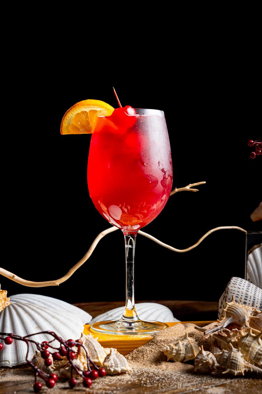 Silver Tequila, Peach Schnapps, Orange Juice, Pineapple, Pomegranate Syrup, Ginger Ale