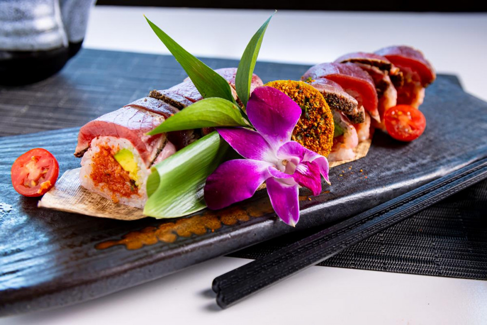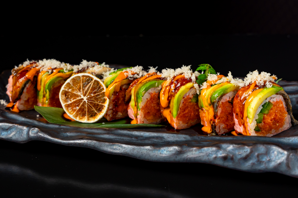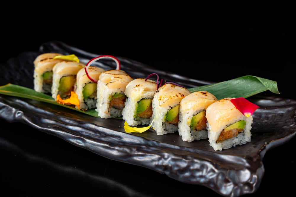 Tuna, Salmon, yellowtail, cucumber, topped with tuna, salmon, served with Sriracha and Spicy Kabayaki Aioli