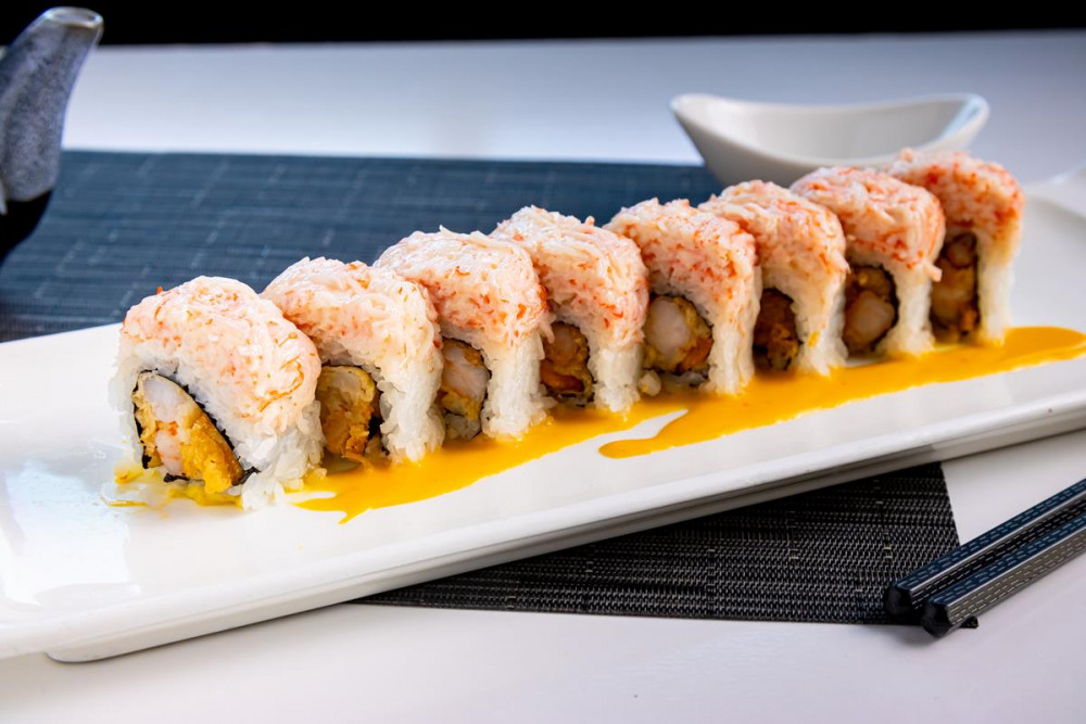 Rock shrimp tempura inside, topped w. spicy lobster & kani, served with Mango Sauce