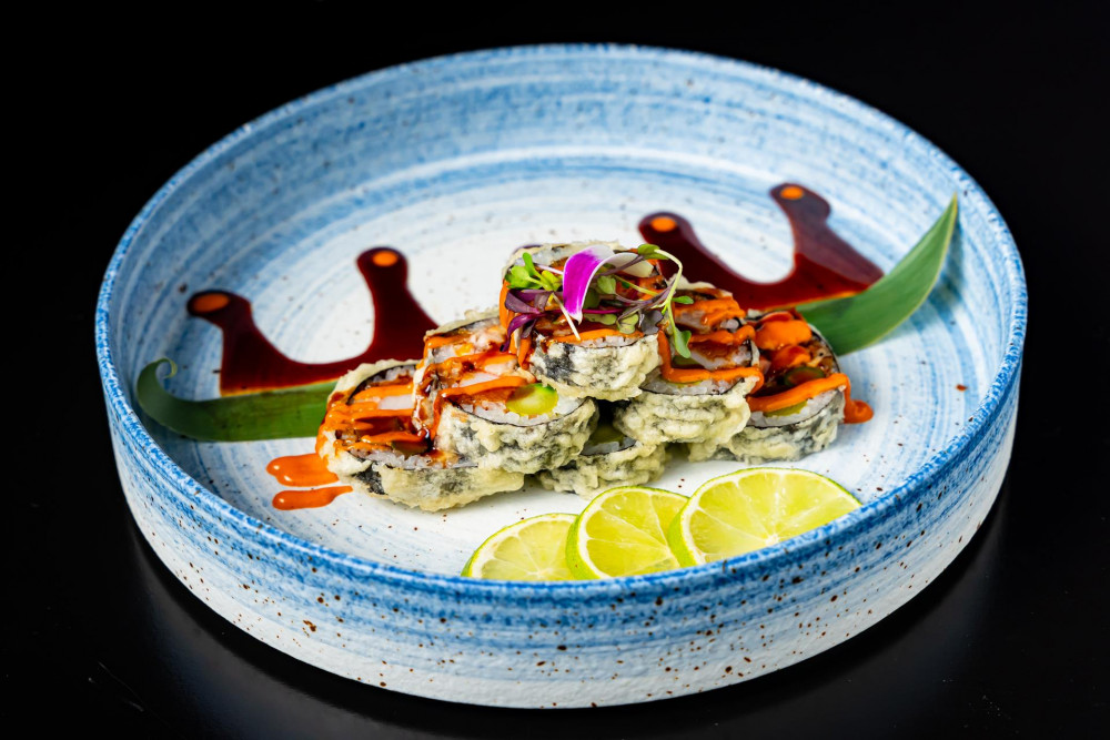 Lightly fried white fish, asparagus, crab meat, & eel inside, seaweed outside, mixed with miso & Spicy Mayo