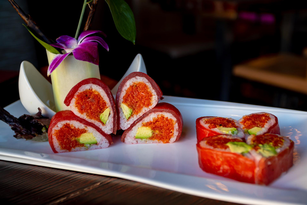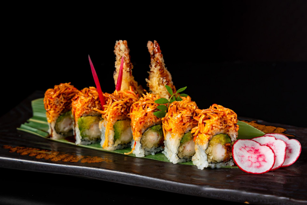 Shrimp tempura, spicy tuna inside, soy nori wrap, topped with salmon, tuna, and avocado, Spicy Aka Sauce
