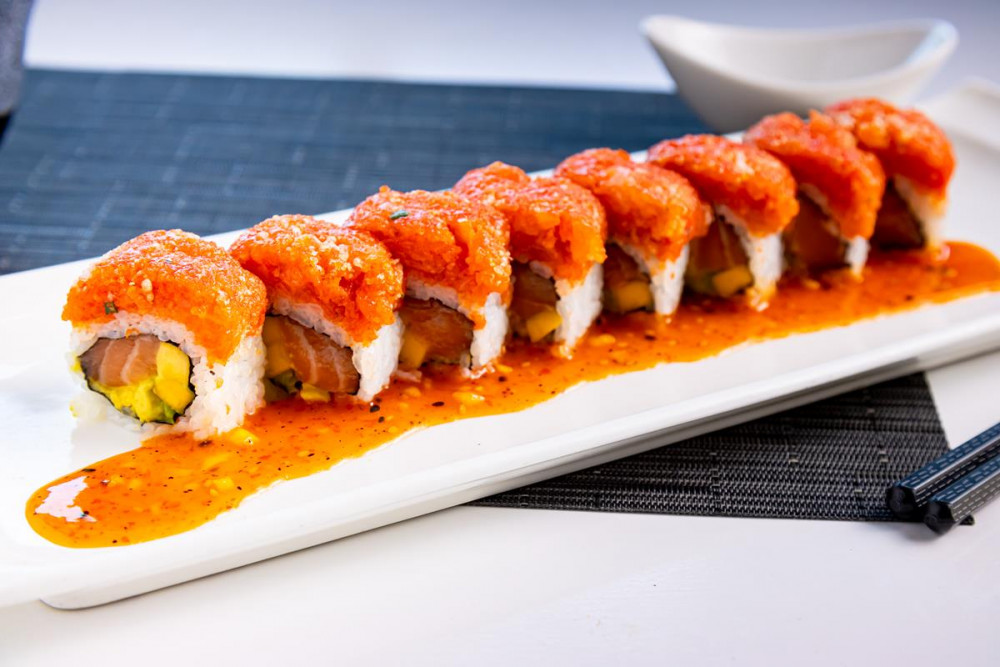 Spicy salmon, avocado, and mango inside, topped with sliced salmon, Thai Mango Salsa