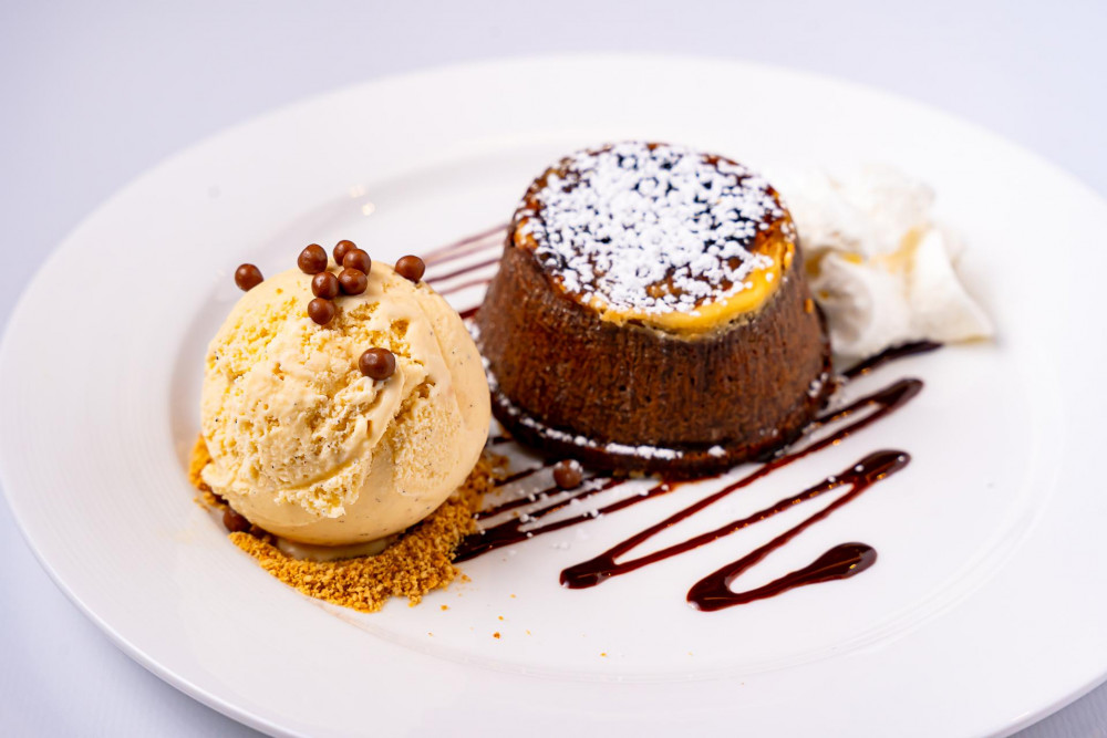 Savor cake with a slightly crisp exterior and a warm, molten chocolate center. Served