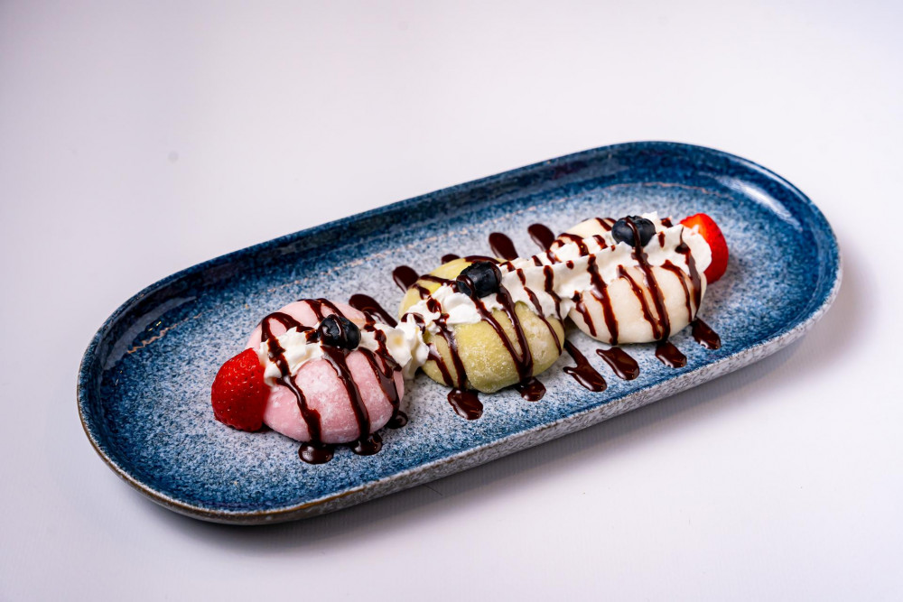 Encased in a soft, chewy mochi shell lies a scoop of velvety ice cream, Served with