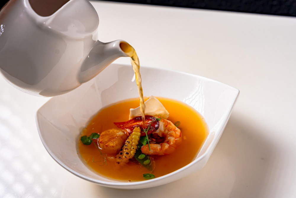 Lobster bisque with lobster meat, shrimp, scallop. toasted mozzarella bread